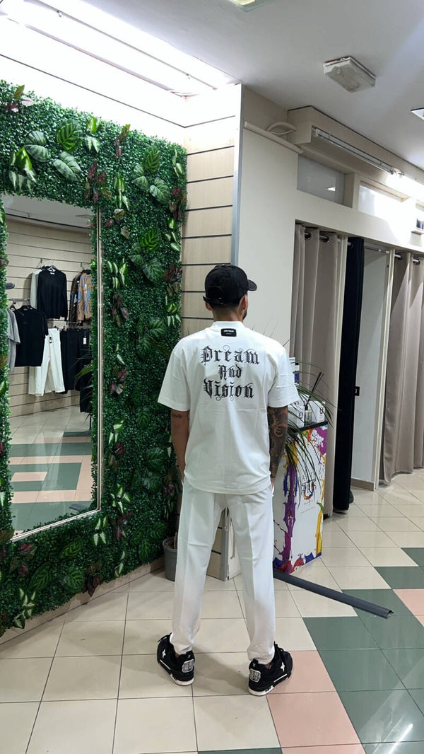 T-shirt bianca con scritta piccola anteriore e con scritta più grande posteriore